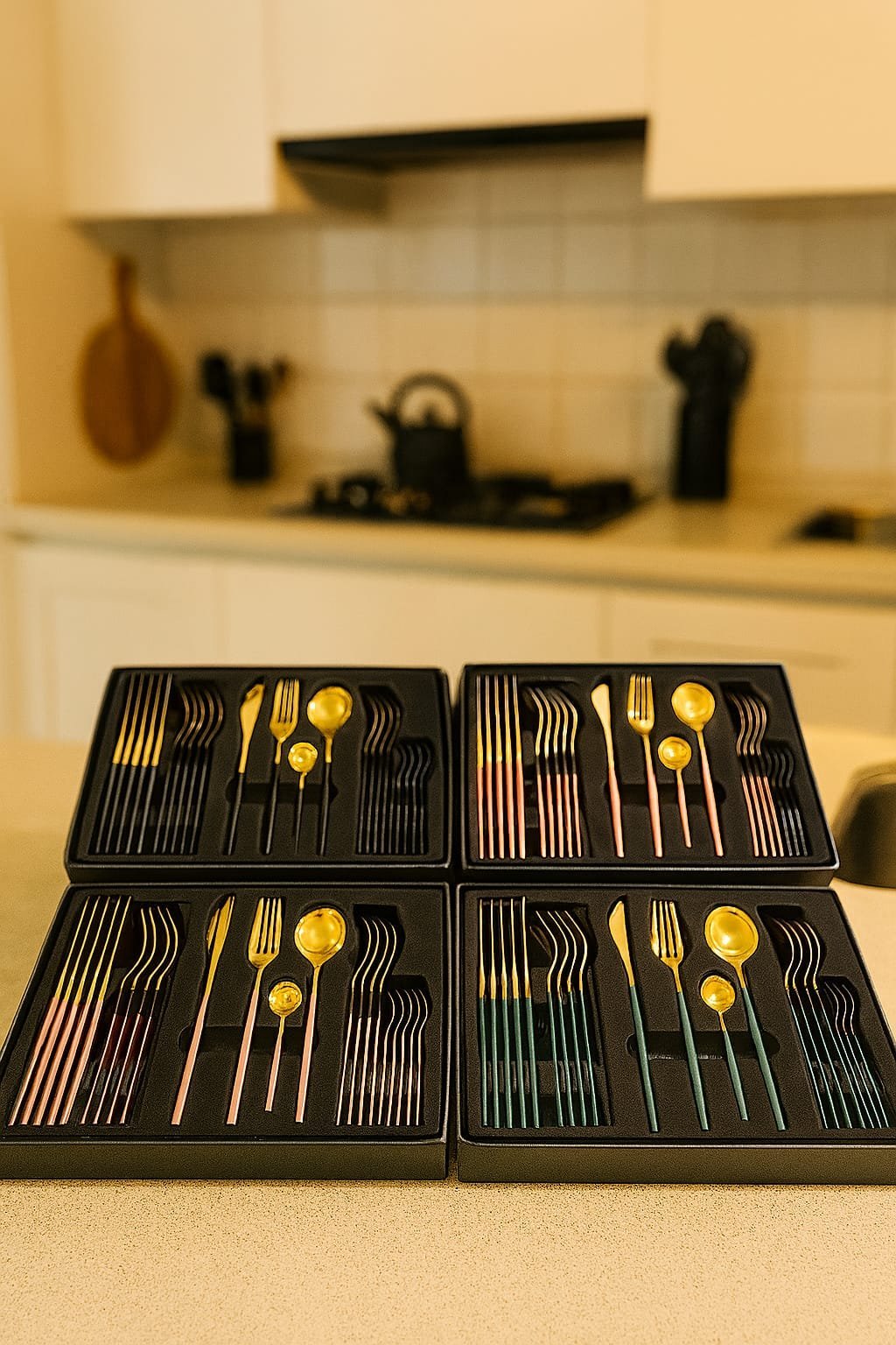 طقم معالق ذهبي فاخر 24 قطعة – ستانلس ستيل بألوان عصرية أنيقة